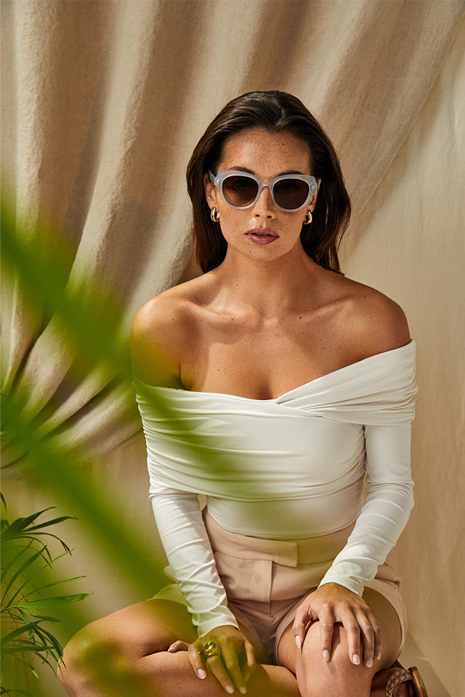 These airy frames will make you feel like you’re floating on cloud nine. The lightweight frosted acetate combines curvy, floral-inspired corners with an exaggerated temple to create a striking shape that’s ready for its moment.
